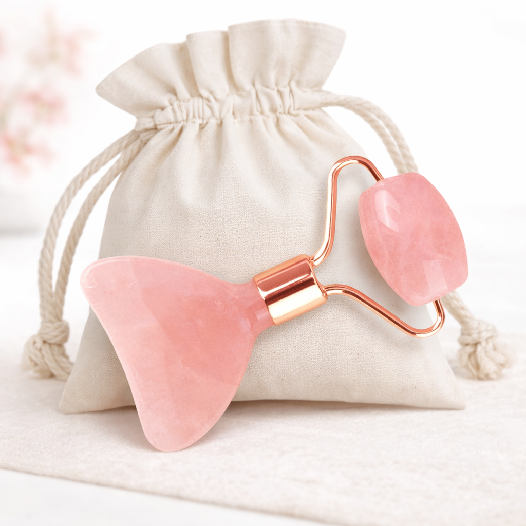 Luxury Gua Sha Roller with Both Scrapper and Roller in One! This unique Tool comes with a Cotton Muslin Bag for Gua Sha on the go!